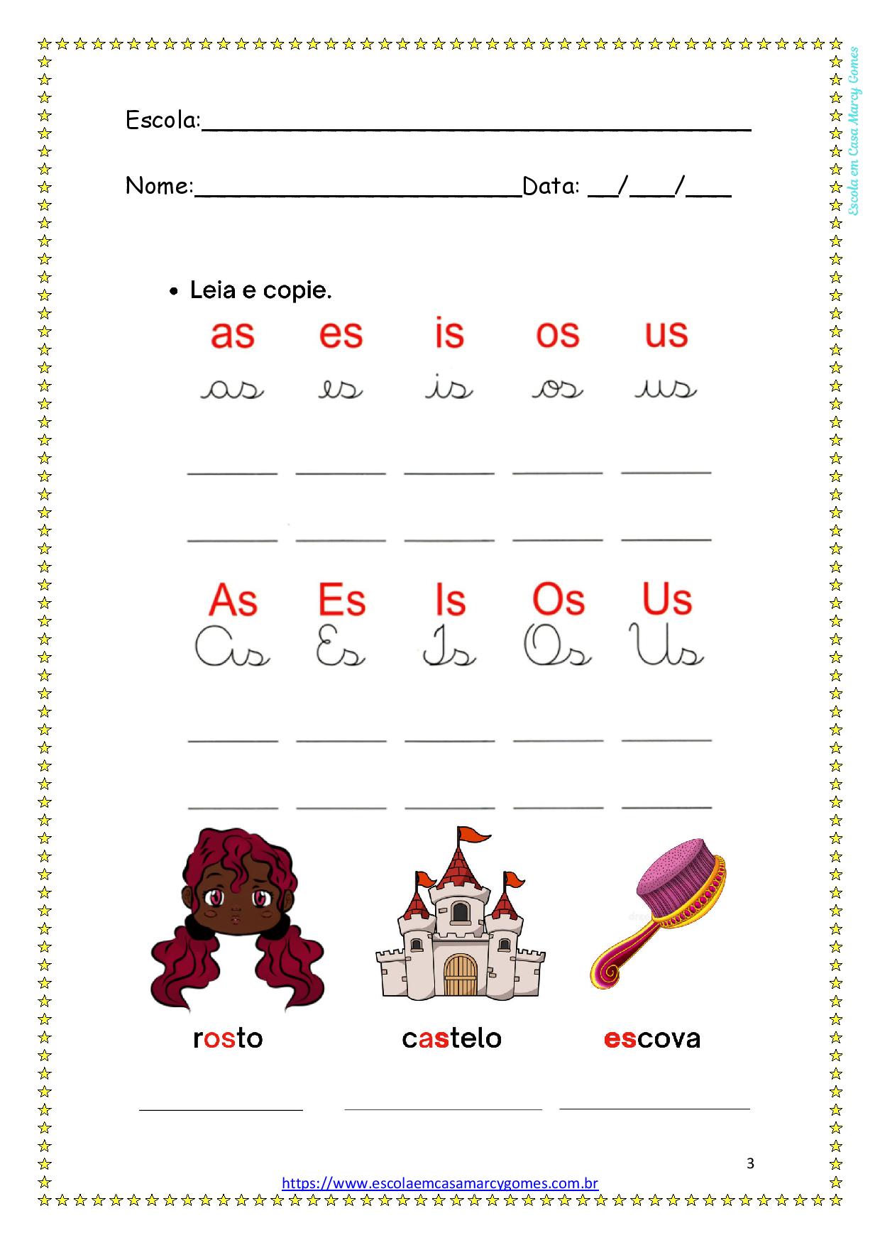 CONTEÚDO: • AS, ES, IS, OS, US • AL, EL, IL, OL, UL • AN, EN, IN, ON, UN • AM, EM, IM, OM, UM • GUA/GUO • GUE/GUI • ÇA, CO, ÇU • HA, HE, HI, HO, HU • QUA/QUO • QUE/QUI • AZ, EZ, IZ, OZ, UZ • BLA, BLE, BLI, BLO, BLU • CLA, CLE, CLI, CLO, CLU • FLA, FLE, FLI, FLO, FLU • GLA, GLE, GLI, GLO, GLU • PLA, PLE, PLI, PLO, PLU • TLA, TLE, TLI, TLO, TLU • BRA, BRE, BRI, BRO, BRU • CRA, CRE, CRI, CRO, CU • DRA, DRE, DRI, DRO, DRU • FRA, FRE, FRI, FRO, FRU • GRA, GRE, GRI, GRO, GRU.